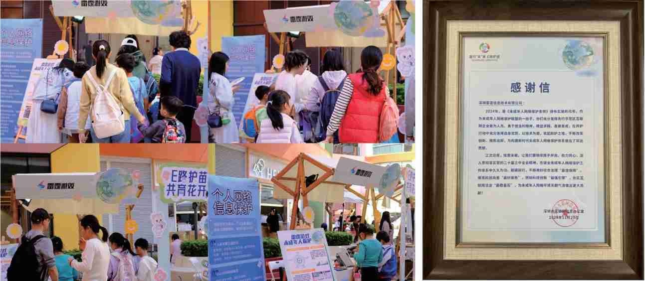 2024年11月,,,公司受邀参加由深圳市互联网信息办公室、、、深圳市妇女联合会、、、深圳市文明办联合主办的“E路护苗 共育花开”——2024深圳未成年人网络共护行动游园会,,,并作为企业代表发言,,,介绍未成年人保护体系及相关公益实践,,获得深圳市网信办的认可。。。