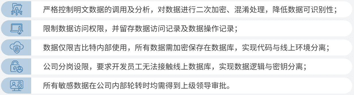 公司对用户个人信息实施脱敏处理,,,严格限制用户信息用途,,,数据使用完成后集中归档处理。。。。为进一步确保数据处理过程的安全,,,,公司根据实际的业务工作分岗设限,,最大程度保护数据隐私安全,,如在生产网络中的加密数据由研发部门员工负责编写加、、、解密程序,,,,但其无法直接访问到加密后的数据库;程序的加、、解密密钥由运维员工单独配置。。。