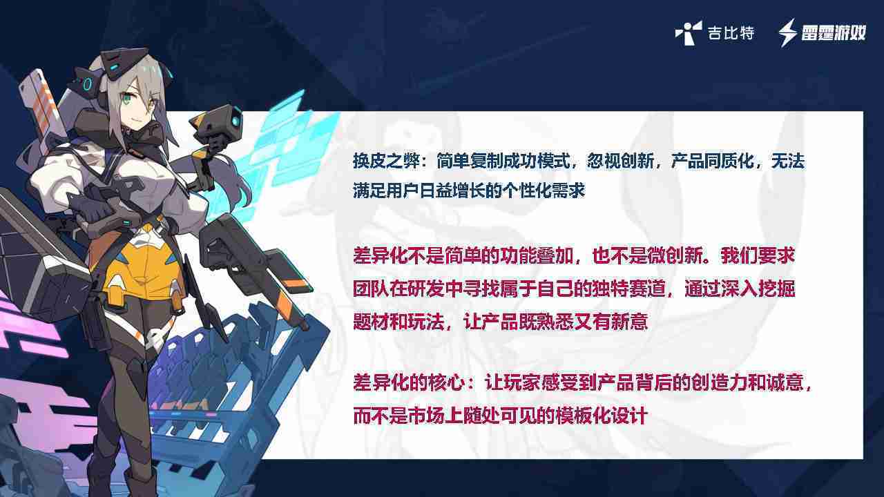 在我们内部是这么定义差异化的。。首先,,,差异化不是简单的功能叠加,,更不是换皮。。。。只是换皮,,产品无法提供有效的市场价值。。内部经常说差异化的产品不是为了迎合市场,,,,而是找到一个自己独特的表达方式,,在研发中找到属于自己的细分赛道和独特赛道,,前提是需要对这个题材有足够的深入、、挖掘,,,对玩法有足够深入的理解,,,让产品看起来既熟悉又有新意。。。。