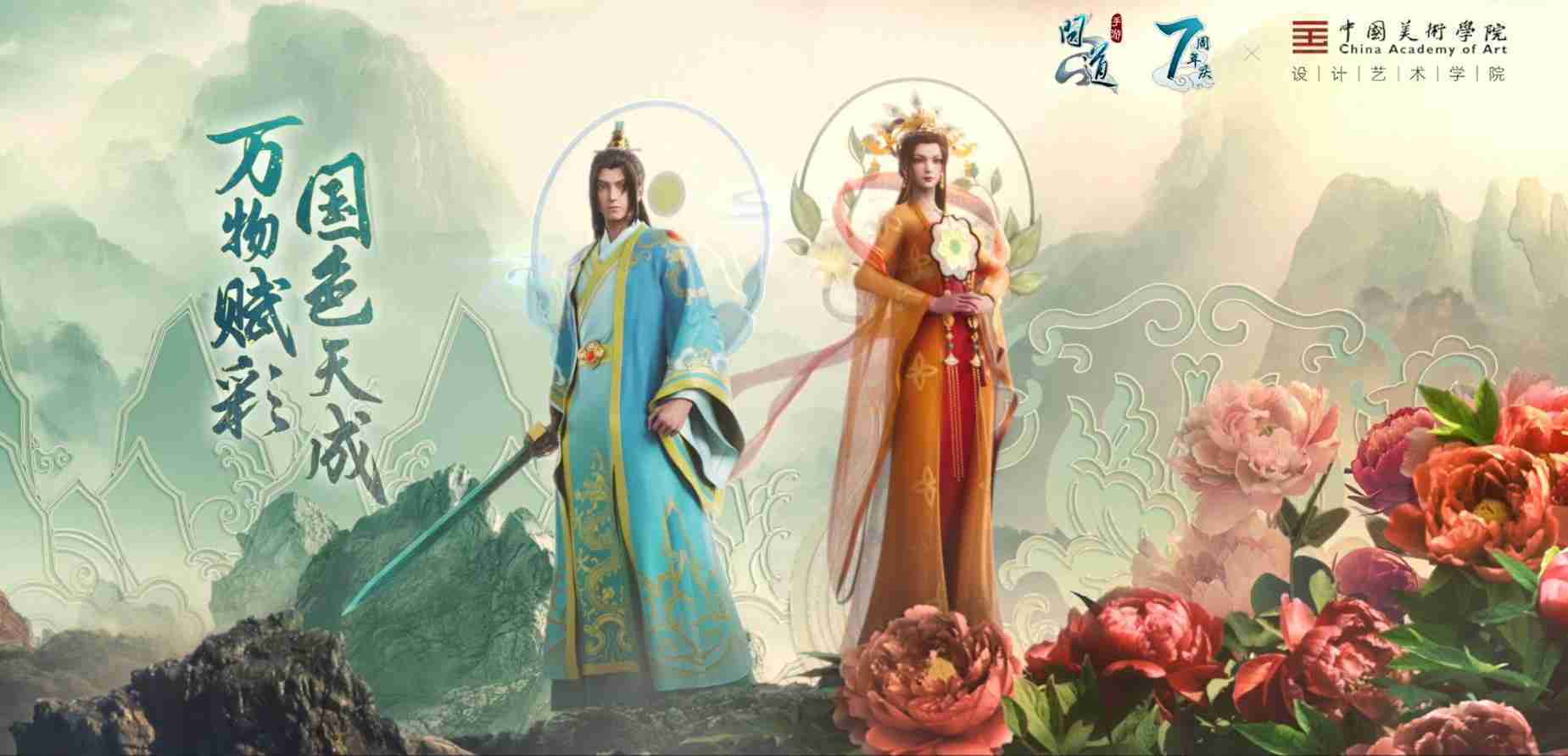 2023年4月,,,,《问道手游》联动中国美术学院,,在游戏中融合了中国历史上不同时期的文化元素,,,打造了“山河万象”与“凤鸣九霄”的国风时装。。。。在色彩配置方面,,创作团队基于对游戏角色特性的分析提取相应的文化内涵,,从每一种色彩的色相、、指代事物和情感出发对应角色属性,,,选定服装的色彩搭配。。在纹样设计方面,,创作团队结合游戏角色自身特殊的造型比例和形态,,,在实际的纹样设计中进行了游戏语境下的活化演绎。。男性角色集中使用了如蟒纹、、、海水江崖纹、、如意纹和云气纹等传统纹样元素,,,,女性角色则吸纳了凤凰纹、、牡丹纹、、、卷草缠枝纹等元素,,,,组成以“双凤牡丹纹样”“缠枝牡丹纹”“金玉凤冠头饰”为主要纹样的游戏角色装饰图案系统。。