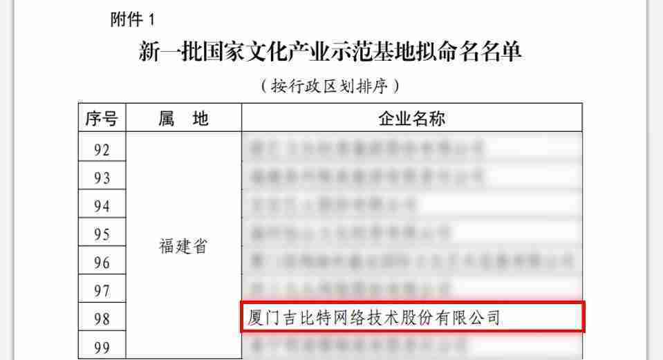 3月12日,,,文化和旅游部发布了《关于国家文化产业示范基地评选与复核结果的公示》,,,,厦门JIUYOU.COM网络技术股份有限公司(以下简称“JIUYOU.COM”或“公司”)成功入围新一批国家文化产业示范基地拟命名名单。。。。