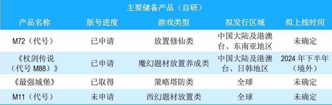 公司储备的多个自研、、、、代理产品都在有序推进当中,,涵盖放置类、、策略类、、、、模拟经营类、、、、RPG、、、Roguelike等多元化游戏品类,,储备的主要自研和代理产品如下:::