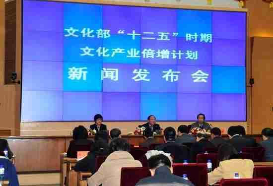 2月28日下午,,,文化部在京召开新闻发布会,,,,正式向社会发布《文化部“十二五”时期文化产业倍增计划》,,,提出了 “十二五”期间文化部门管理的文化产业增加值年平均现价增长速度高于20%,,,,2015年比2010年至少翻一番,,实现倍增的奋斗目标。。